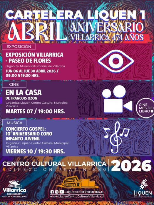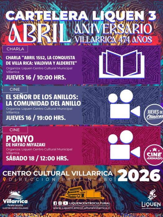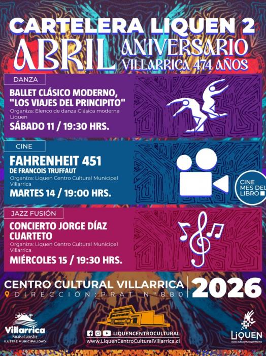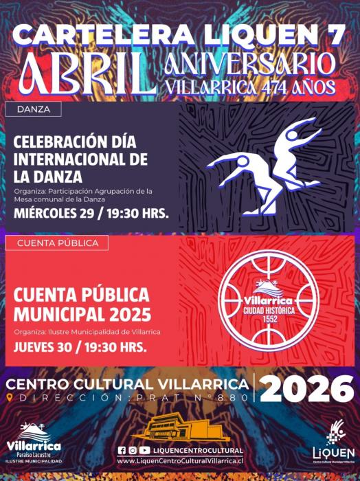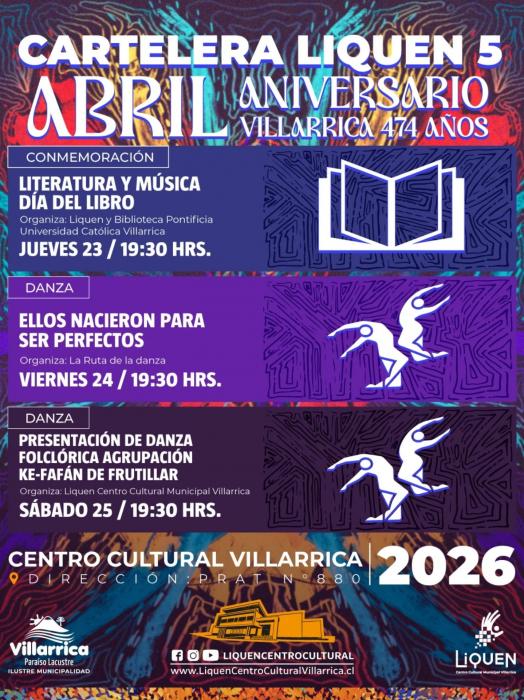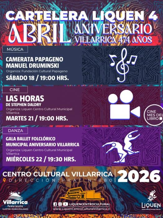 Cartelera Liquen Centro Cultural Municipal de Villarrica abril 2026