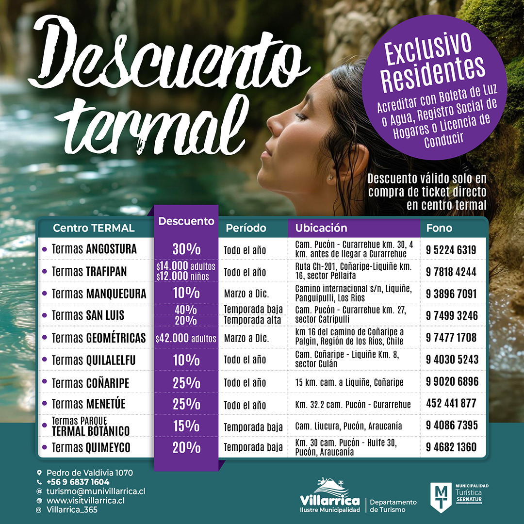 Consultas al fono: +56 9 6837 1604 Oficina de Turismo, Ilustre Municipalidad de Villarrica.