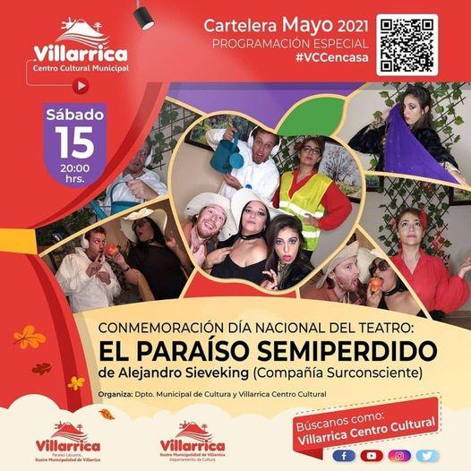 En el marco de la Conmemoración del Día Nacional del Teatro, que se celebra cada 11 de mayo, VILLARRICA CENTRO CULTURAL presenta la obra teatral “EL PARAÍSO SEMIPERDIDO” de Alejandro Sieveking, con la Compañía local Surconsciente.